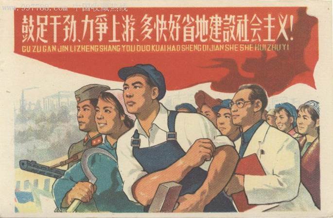 在社会主义改造与第一个五年计划取得伟大胜利的情况下,1958年5月党的八大二次会议正式通过了社会主义建设总路线,号召全党和全国人民,争取在15年或者更短时间内,在主要工业产品的产量方面赶上和超过英国。会后,全国各条战线迅速掀起了“大跃进”的高潮。1958年8月,中共中央政治局在北戴河举行扩大会议,确定了一批工农业生产的高指标,提出1958年钢产量要在1957年535万吨的基础上翻一番,达到1070万吨,作为1958年实现“大跃进”的主要步骤。会议还决定在农村普遍建立人民公社。会后,全国开始了全民炼钢和农村人民公社化运动。同时,交通、邮电、教育、文化、卫生等事业也都开展“全民大办”,把“大跃进”运动推向了高潮。这就使经济建设中的高指标、瞎指挥、浮夸风泛滥开来。1960年冬,中共中央和毛泽东开始纠正农村工作中的“左”倾错误,“大跃进”才被停止。“大跃进”造成了国民经济比例严重失调,使社会主义建设事业受到重大损失。