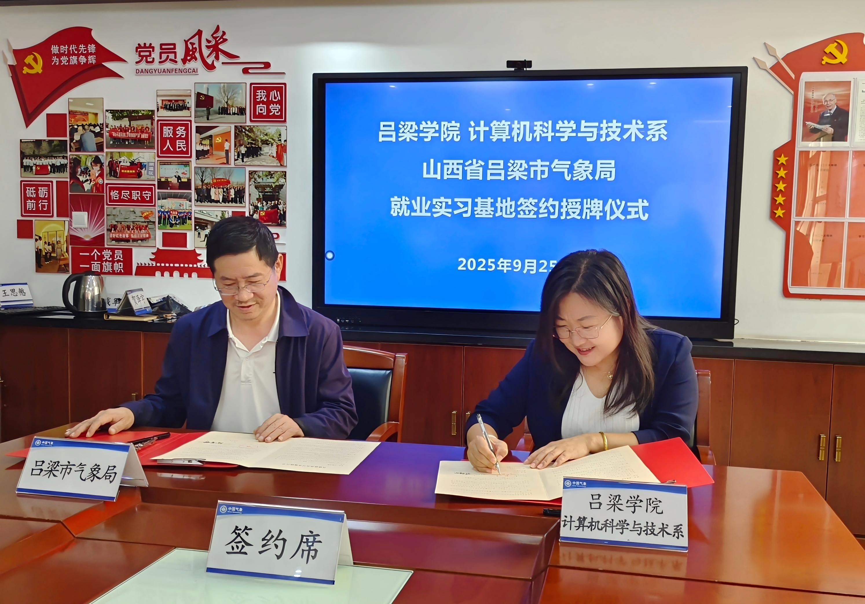 为深入贯彻落实教育部关于加强校地协同育人相关要求,进一步拓宽学生就业实践渠道。2025年9月25日,必威西汉姆联与吕梁市气象局举行校地实习实训基地签约及授牌仪式。必威西汉姆联党总支书记李志荣、系副主任武桂芬,吕梁市气象局局长卫徐刚等相关人员出席签约仪式。
