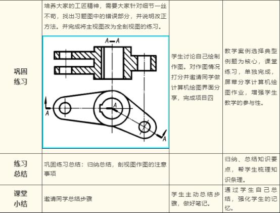 第二,将课堂教学、批判思考和社会服务结合起来。在本次课堂设计中,会有查找错误包括剖视图绘制时漏线等问题的设计,让学生思考作为当代大学生如何学习工匠精神。最后,培养学生敬业、精益、专注、创新以及从业后拥有这种职业价值取向和行为表现。