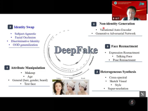 首先是赫然教授带来了“视觉内容生成与安全”的主题报告,介绍了在视觉内容生成与安全的近期研究工作,主要包括基础表示和生成模型,最优传输生成模型和信息瓶颈解耦生成模型,以及语音驱动说话人、人脸表情驱动和人物换脸等内容生成方法,同时也介绍视觉内容的溯源和鉴别等可信安全方法,并提出了目前在泛化性、表示信息纠缠、音视频一致性、配对训练数据、极端姿态表情等方面的存在的挑战问题。