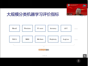 连德富教授分享了“面向大规模分类任务的机器学习” 的主题报告,介绍了大规模分类任务的研究背景及意义、评价指标、学习体系等,重点介绍了大规模分类任务的模型推理、训练目标、训练过程,以及大规模分类机器学习的推荐系统开源库,总结了大规模分类机器学习的常用损失、近似推断的设计思路和算法以及负样本采样的最新进展。
