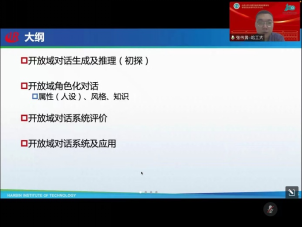 张伟男副教授就开放域对话关键技术研究及应用进行了讲解,针对开放域人机对话中的生成、推理、角色化和对话系统评价等关键技术和应用进行介绍,分析在对话风格化面临的挑战,同时介绍语义和风格解耦合的风格化对话生成中遇到的挑战,方法和最新进展,应用在科大讯飞的产品及AI主播、母婴领域虚拟主播、智能人机对话系统“笨笨”,实现了首个中文开放域聊天机器人技术开放平台(CTP),CTP系统级别自动评价等,最后进行了总结与展望。