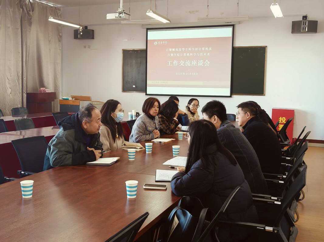2023年11月16日上午,吕梁师范高等专科学校计算机系秦瑞峰一行5人来我系进行工作交流座谈,我系党总支书记李志荣、系主任高文莲、副主任高永强和武桂芬、分团委书记薛艳芳以及各教研室主任、全体辅导员出席此次交流座谈。会议由系主任高文莲主持。