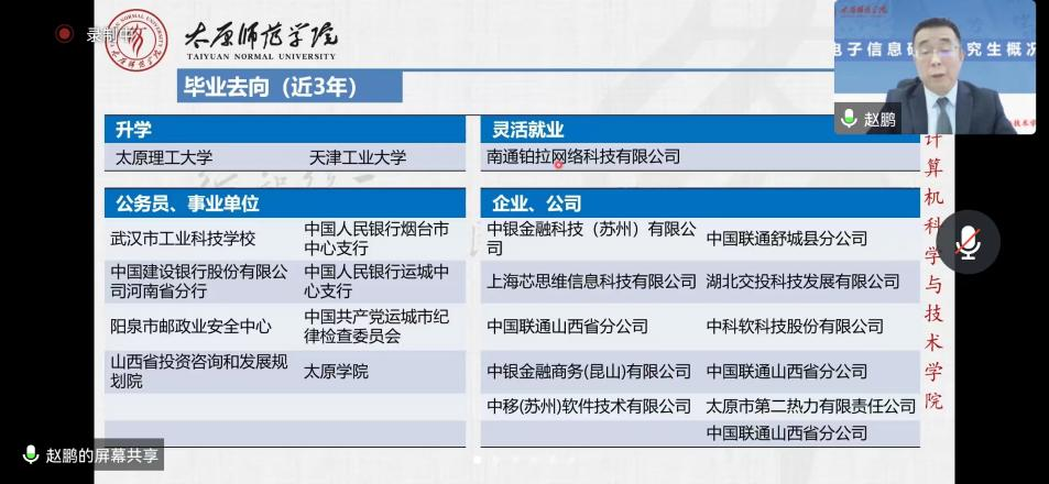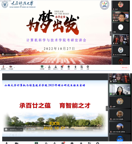 为帮助我系2019级、2020级同学做好职业生涯规划,助力有意深造的同学明确考研方向,掌握考研技巧,坚定考研信心,2022年10月底到11月初,我系通过腾讯会议的形式分别邀请山西大学计算机与信息技术学院院长王文剑教授、太原理工大学信息与计算机学院副院长强彦教授、太原科技大学计算机学院崔志华教授、太原师范学院必威西汉姆联主任赵鹏教授为我系学子举行了考研宣讲系列活动。我系高文莲书记、刘继华主任、武桂芬副主任以及青年教师、班主任全程参与,2019、2020级近300名同学参会。