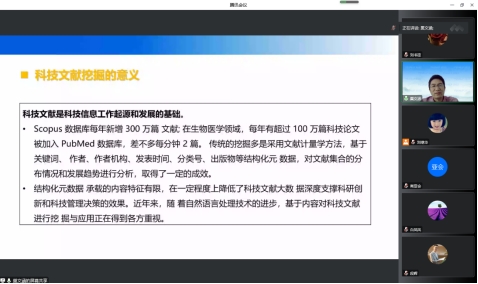 巢文涵教授做了题为“融合智能推理的科技文献挖掘方法”的报告,在本次报告中,巢教授介绍了课题组在该方向的最新研究成果,包括科技文献贡献描述分类和细粒度论元信息抽取,基于科技文献论辩结构的多模态对齐,并进一步探讨如何科学有效的验证科技论点等科技文献知识挖掘方法。