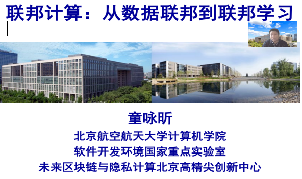 童咏昕教授做了题为“联邦计算——从数据联邦到联邦学习”的报告,童教授首先回顾安全多方计算技术与数据科学领域的融合发展历程,介绍本团队所研发的数据联邦系统——“虎符”,对其应用场景与原理做了深度分析;随后阐述数据联邦与联邦学习的区别与联系,并分析当前联邦学习的前沿技术;最后对该领域当前挑战和未来发展进行总结展望。